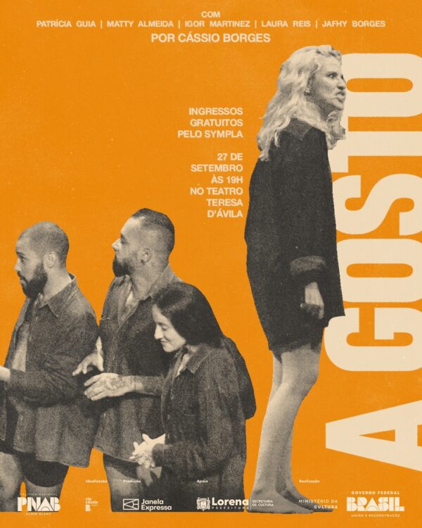 Neste sábado, dia 27 de setembro, às 19h, o Teatro Teresa D’Ávila, em Lorena, recebe o espetáculo de teatro A Gosto, da Cia Cássio B de Teatro, realizado com recursos da Lei Aldir Blanc e apoio da Prefeitura de Lorena e da Secretaria de Cultura.
