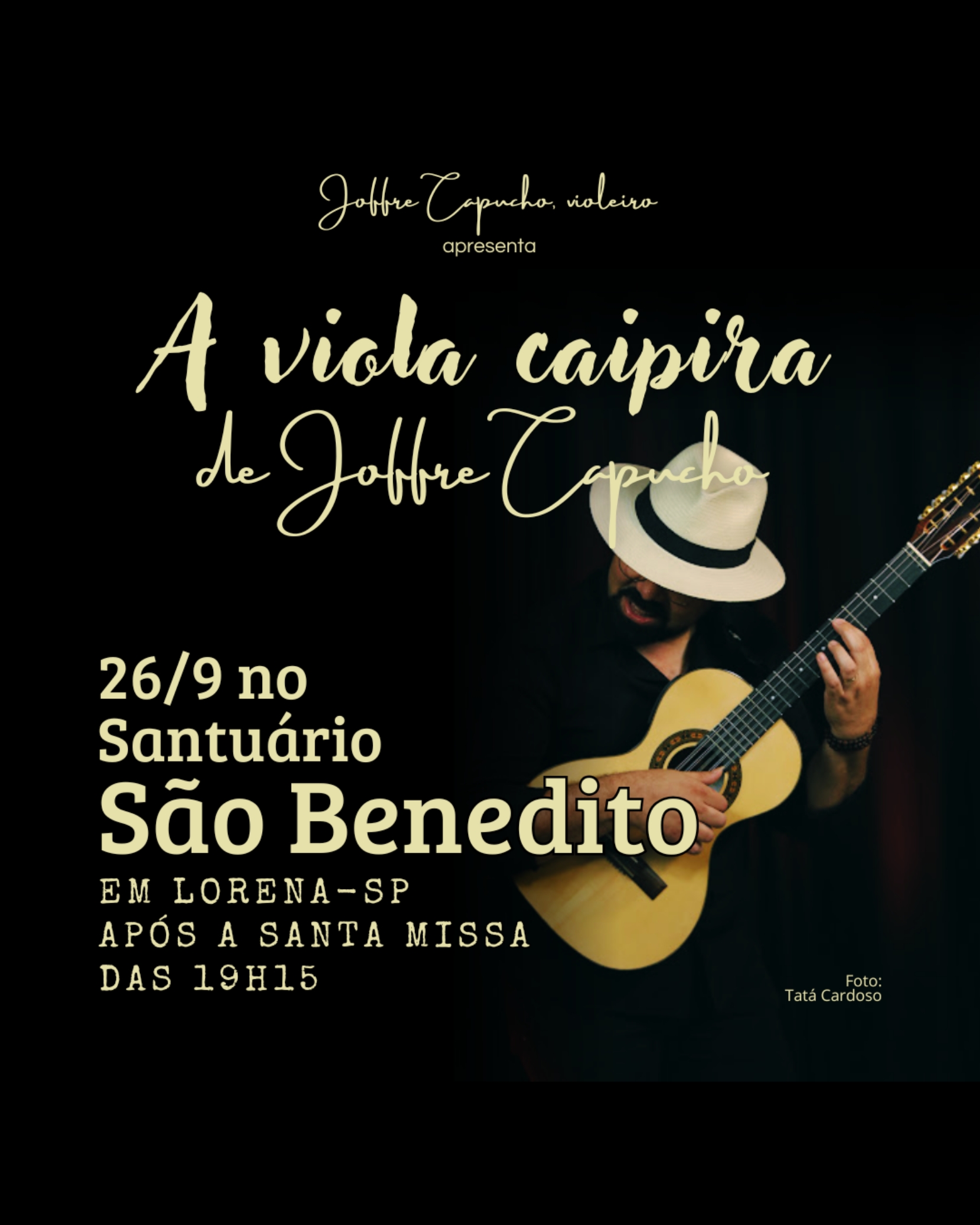 Espetáculo em voz e viola caipira: cantos, contos e outros tantos que louvam as raizes do povo caipira, especialmente do Vale do Paraíba. Atração da programação da Festa de São Benedito em Lorena-SP.
