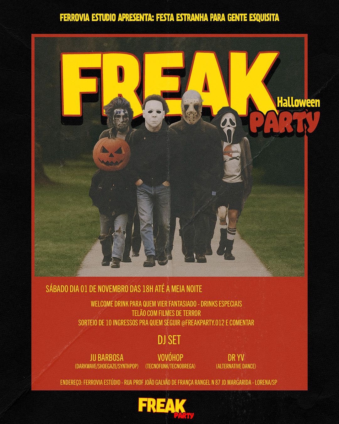 Dia 1/nov vem aí a primeira @freakparty.012 - especial de halloween! 🍹WELCOME DRINK para quem vier fantasiado - drinks especiais 🎃 TELÃO com filmes de terror 💸 SORTEIO DE 10 ...